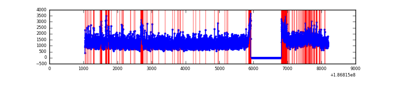 Blue bars denote a histogram of data divided into 1 sec bins.