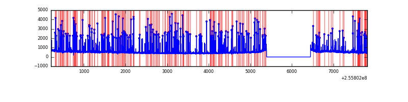 Blue bars denote a histogram of data divided into 1 sec bins.